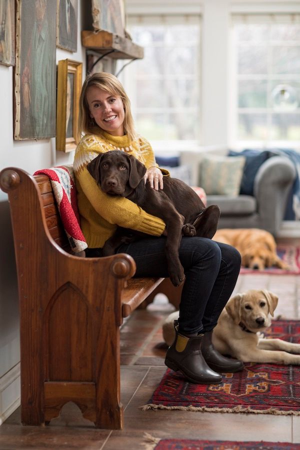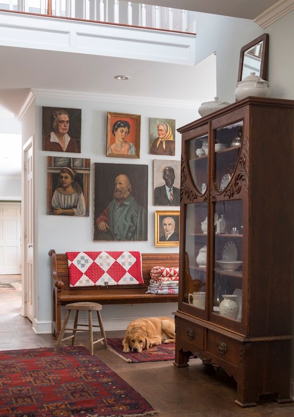 CAST OF CHARACTERS. When it comes to vintage portraits, such as ones in this hallway, Carolyn doesn’t mind if they’re tattered. “It shows they’ve been loved,” she says. She never pays more than $40 for one. Carolyn’s grandma made the quilts on the pew in the 1920s and ‘30s. Below it all, a tile floor gives the home needed durability for raising four kids and three dogs. Carolyn (with dogs Lucy, Theo and Harry) credits her mom with getting her hooked on vintage.