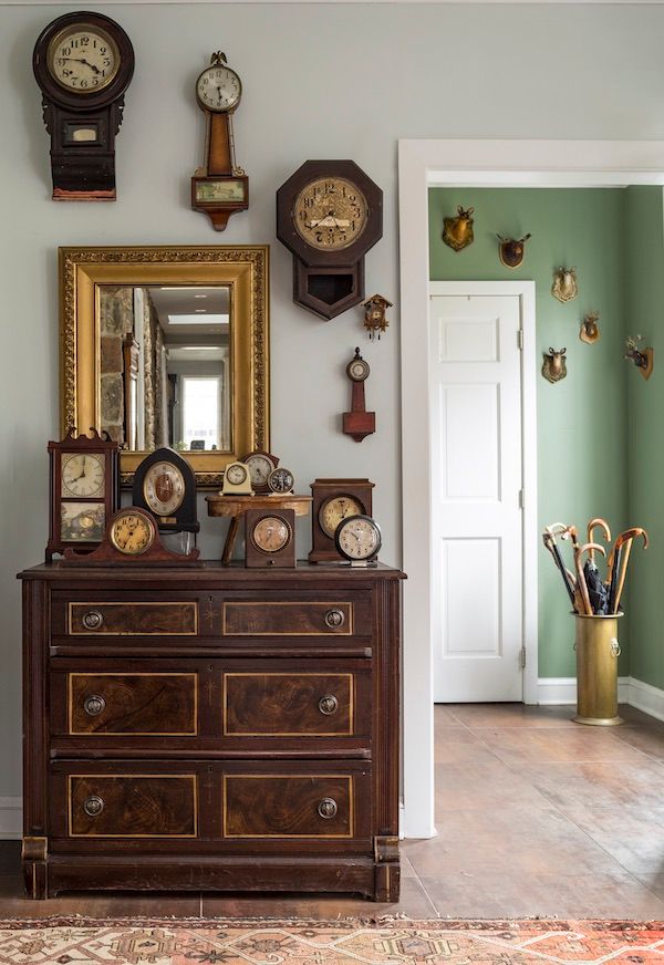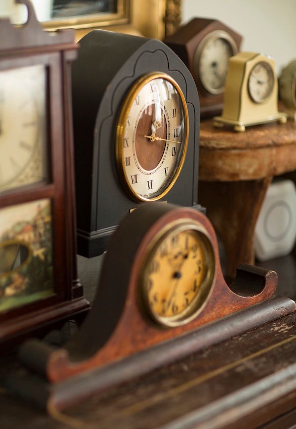 TIME OUT. Clocks are one of Carolyn’s weaknesses—even if they don’t work. Chalkware deer heads visible through the doorway were just $10 for a box of them. The seller said she collected them at national parks in the 1960s.