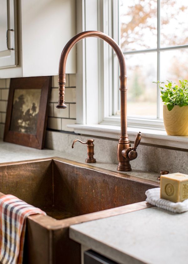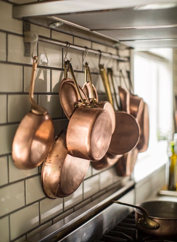 COPPER QUEST. Vintage copper pots range in quality. Some are French copper, and some are newer and less expensive. Many were left behind by the previous owners. The pans are tough to keep clean, so Carolyn chooses to let the patina develop in its own beautiful way. Similarly, the copper sink shines up nicely and brings vintage character, but Carolyn prefers it with scuffs that are a sign of a hardworking kitchen.