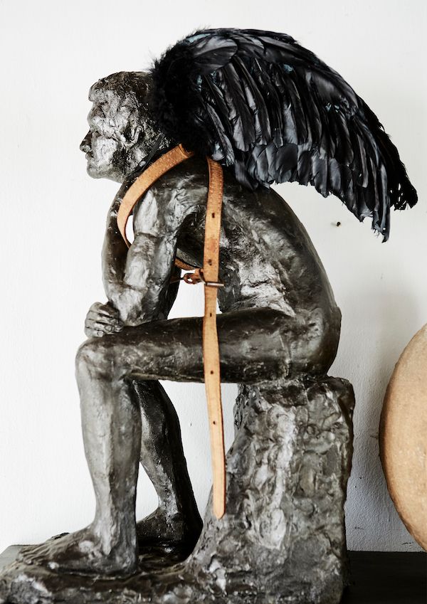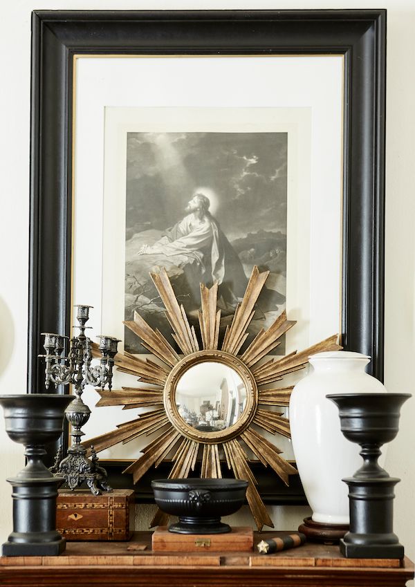 DIVINE INSPIRATION. Cobus made the beautiful sculpture while he was a student that’s currently enjoying its incarnation as a fallen angel in his shop. The Italian Regency style starburst mirror is gilded plaster of Paris. The Wedgwood basalt urns are some of Cobus’s current prized collectibles. The religious image was found in Belgium.