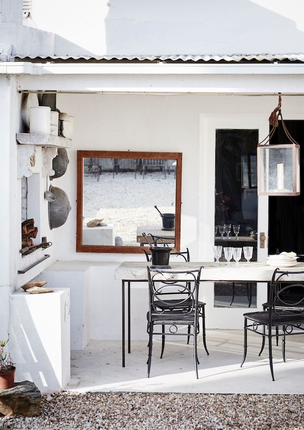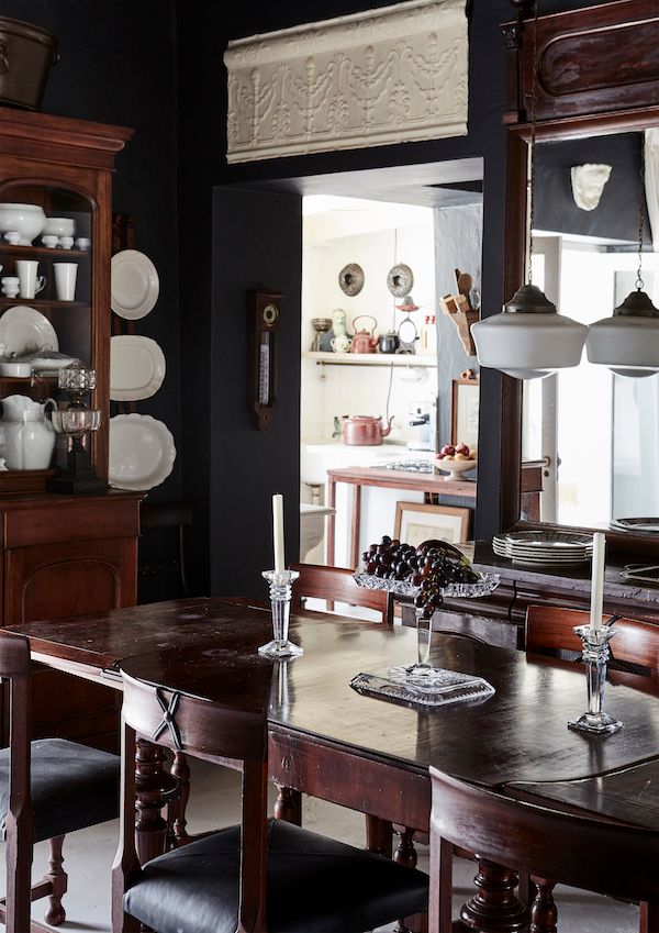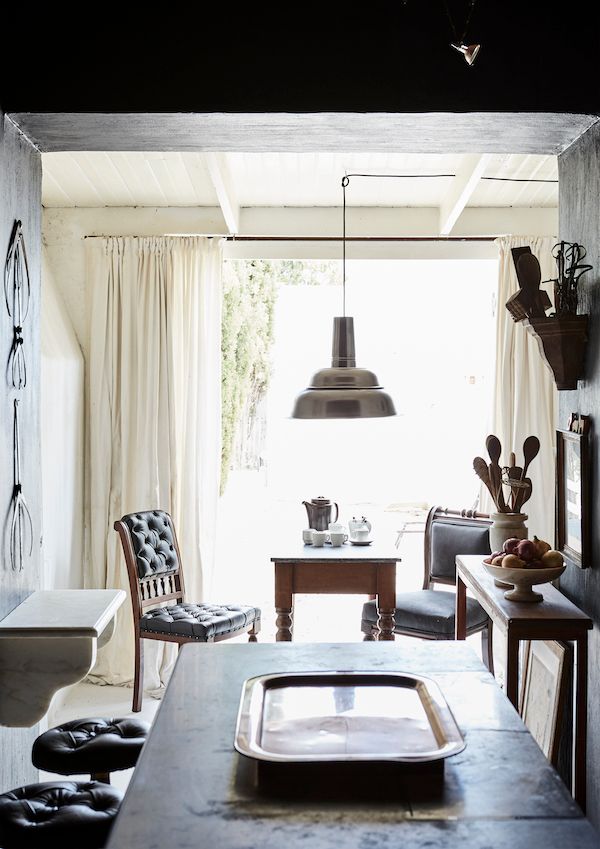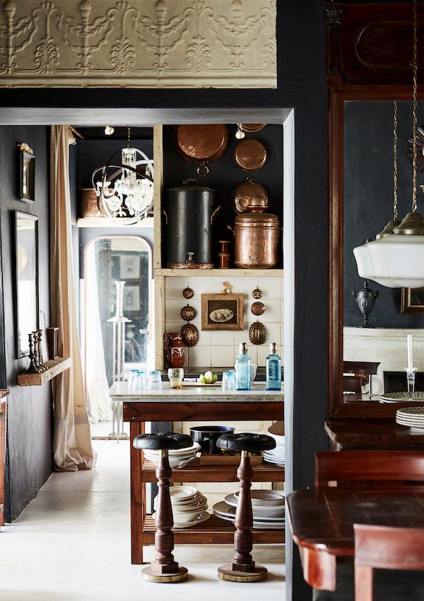 CHARACTER STUDY. An oversized mirror bounces light beautifully in the dining room. The old lampshades were salvaged from a church and the large bureau is filled with platters which Cobus uses when he entertains. The kitchen, which plays host to an old workbench with a reclaimed marble top, pays homage to the past beautifully. Collections of old copper molds glow against their black painted backdrop.