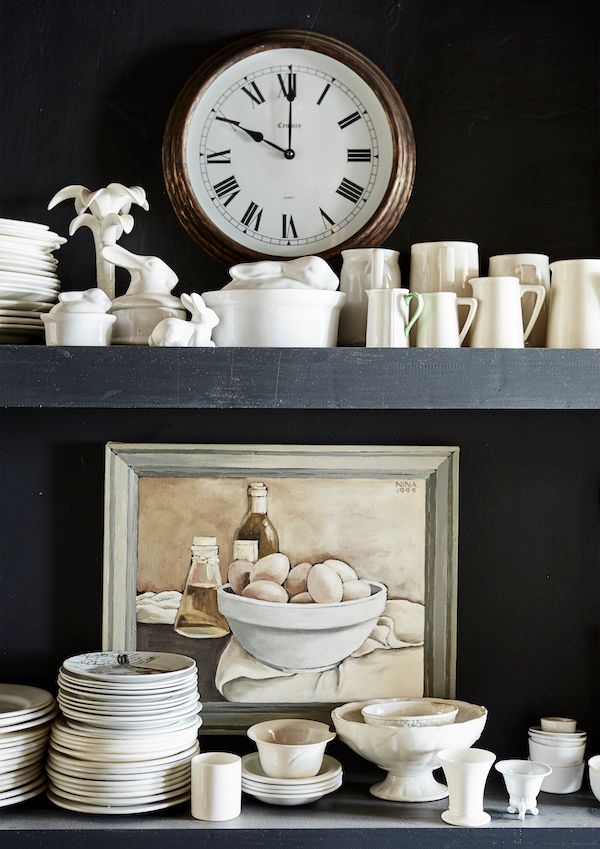 As an avid collector and a purveyor of décor and furniture, it’s only natural that Cobus van Niekerk becomes attached to some of the wonderful discoveries he finds at auctions or by chance in exotic locales. But for the most part, once he’s had his fill of enjoyment, he’s happy to pass on his finds to his customers who visit his antiques and collectibles shop, based right at his home in Stanford, a charming village some two hours from Cape Town, South Africa. “I like to ‘play’ with the items I find, mix them up and move them around,” Cobus says. “I’m not a snob or a purist when it comes to putting a Regency piece with 60’s chairs; in fact, that’s what I love to do. And once I’m ready to move on, then that’s it—goodbye,” he laughs. Of course he’s attached to some key furniture items that he’s had for many years and has a current obsession with urns of all shapes, sizes and materials, but precious he is not. Cobus has lived in Stanford for 20 years. Originally he intended to use his historical escape as a weekend home but gradually the allure of village life proved too strong and he moved here permanently. “Growing up in the sixties, we always lived in modern homes, yet as an adult I longed for an old space,” he says. While original deeds and plans to this historical dwelling have proven impossible to uncover, he estimates that it was built in the late 1700’s. “It’s much older than the other houses here,” says Cobus, who explains that it has been everything from a post office in the 1920’s to the local telephone exchange (now his bedroom) and even a small library. The house is the shape of an upside-down T, with the cross section on the street side and the long, vertical arm, running away from the street. This means that each of the living spaces, from reception room to sitting room, dining room and kitchen lead off from one another. The unusual design is typical of older houses and works perfectly for Cobus, who has decorated his space to unfold a series of visual delights as you delve further into his home. Adding to the sense of theatre is Cobus’s daring use of color. “When I first bought the place, I painted everything all white, the builders were horrified that I was wrecking valuable yellowwood and Oregon pine, but more recently I decided to go with black walls and I love it,” he says. Rather than make his home seem gloomy, it brings a sense of drama to the equation and his gleaming antiques and carefully curated collections pop against their backdrop. As a direct juxtaposition to the moody, black painted interiors, Cobus’s studio and shop is a white painted, light-splashed space. It’s here that this consummate collector’s eclectic and ever-changing cornucopia of quirky finds, prized fossils and his own-designed decorative objects, are on display and for sale. “I studied art and history of art so I know my antiques but I really am not too precious about what I buy, decorate with and sell,” he says, and it seems his unique approach and eye works because his stock doesn’t sit around for very long.