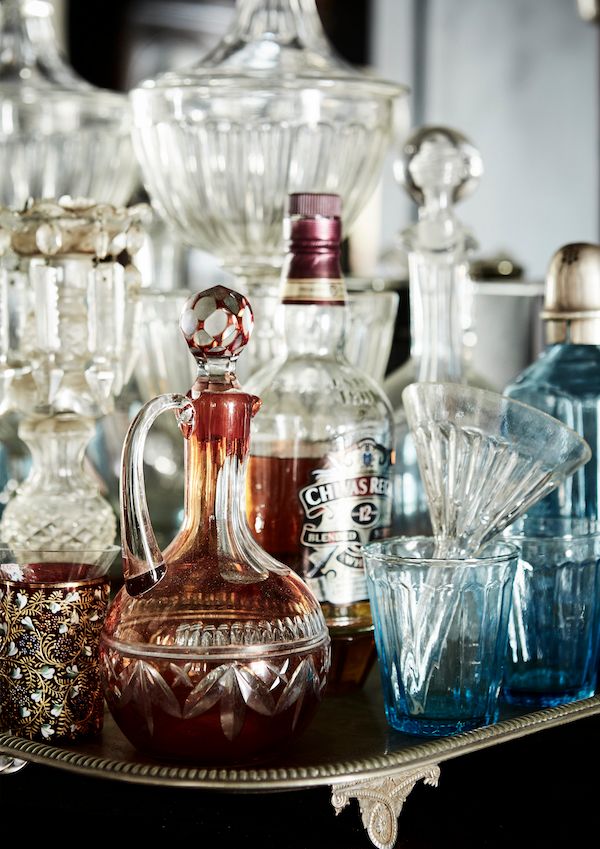 ENTERTAINING NOTIONS. With its built in outdoor fireplace and a wall mounted mirror, the outdoor courtyard is a comfortable and inviting space that’s perfect for entertaining. Decanters and glassware bought in Italy cast beautiful colors and light.