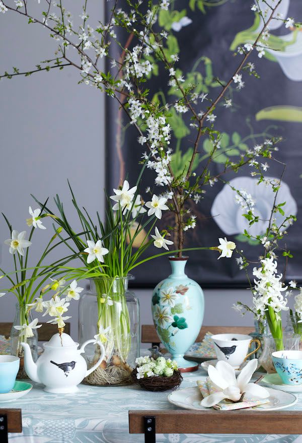 Layering flowers and floral motifs throughout the dining room creates an exuberant effect for an Easter lunch or brunch. Include fresh cuts and potted bulbs, blossom-printed vintage fabrics and china, and botanical artwork to create a magical, blooming garden room. Read on to learn how to recreate this symphony of spring.