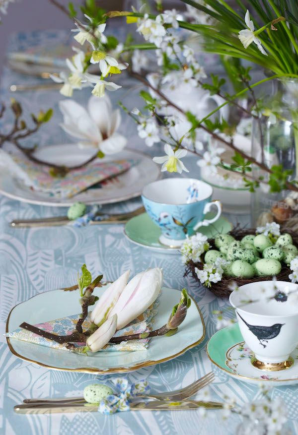 NESTLED IN. Turn a teacup or other interesting pieces of china into pretty table decorations by filling them with edible or decorative eggs. These small ones are quail eggs, which are sold in specialty grocery stores and are typically cream and brown, but decorative versions are often dyed in a rainbow of pastels and sold in crafts shops and especially on sites like Etsy.
