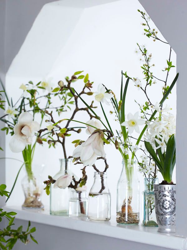 BITS OF BLOSSOMS. Collect a selection of recycled bottles, vases and vessels and place in a row on a windowsill, shelf, or mantlepiece—or tuck them into shelves. Fill each with sprigs of garden cuttings, bulbs and branches. It's a sweet way to display smaller blooms to make a big impact while adding texture, interest and fragrance.