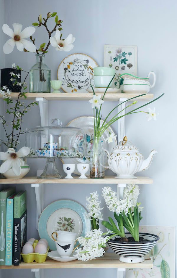 TOUR DE FORCE. Use a sideboard or cupboard as a place to display botanical prints and blooming bulbs and flowers. It takes at least a month, and sometimes two, to force bulbs to grow, but you can buy potted hyacinth, tulips, daffodils and more at garden centers and some grocery stores. To put your own spin on the display, repot some in pretty vintage vessels, like this fluted teacup. Or, simply take a planted pot of bulbs and gently pull out each one, shake off any loose soil and then run the roots under a tap and gently rub to remove the rest of the soil. Place the bulbs in a clear glass jar, or vase with only the roots submerged in water. Replenish the water when needed.