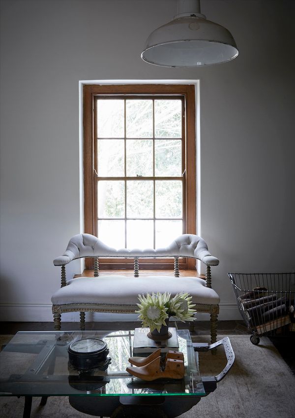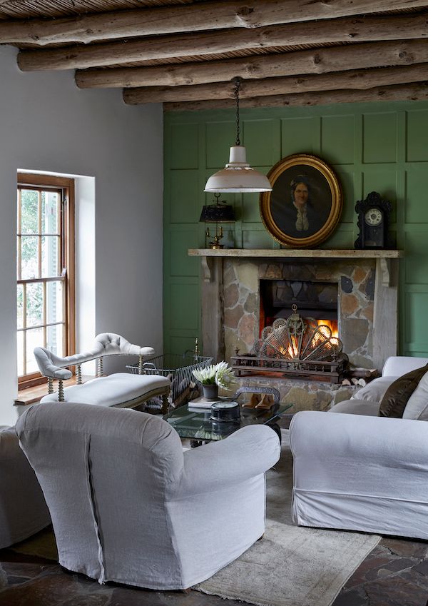 PERFECTLY COZY. Easy-care linen slipcovers stand up to country living and stand out against the paneled and painted back wall, another new element designed to look old. The original reed and log ceiling was restored to their natural timber hues and focal-point fireplace is fronted with a fabulous find from a brass salvage yard. The coffee table is an upcycled piece that Charlotte conceived made from an old wheel barrow topped with glass, and a little loveseat shows off its elegant lines thanks to new upholstery.