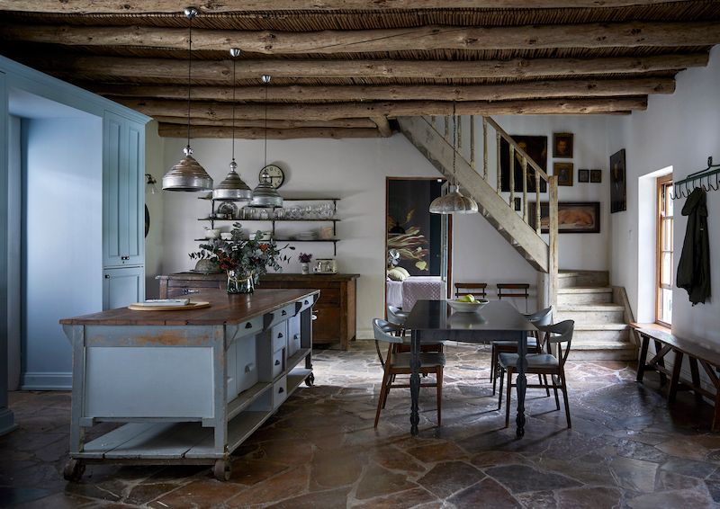 HUNTED & GATHERED. Charlotte created a central kitchen island by adding heavy-duty casters to a large salvaged furniture piece. The worn duck egg blue paint helps to create just the right heritage-inspired mood. Beside it, the dining room table by contemporary designer Gregor Jenkin is an elegant foil to the history-laden details that surround it.
