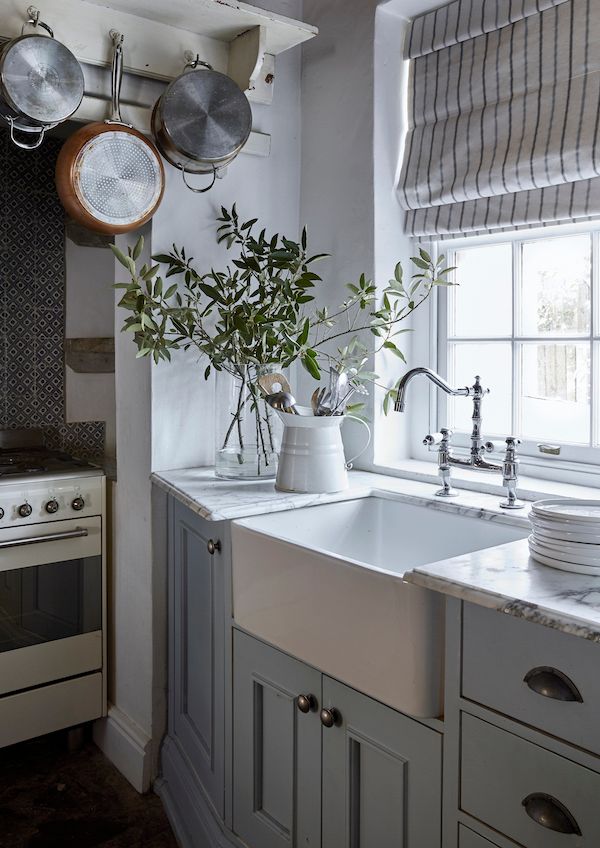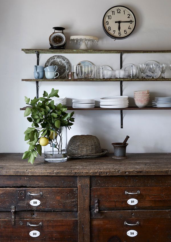 COOKED-UP DESIGN. With no WiFi or TV at the cottage, weekends are focused on slowing down and enjoying downtime—especially cooking. A discreet corner of the kitchen plays host to its hardest working areas, which makes room for a small stove in a nook that may have once housed a cooking hearth, and a porcelain sink with timeless marble countertops. At the far end of the kitchen, a timeworn server oozes personality and history and was a lucky find from a salvage shop. The open shelves made from unpretentious planks and brackets hold daily essentials, and details like the industrial-style clock and sturdy pestle and mortar complete the rustic picture.