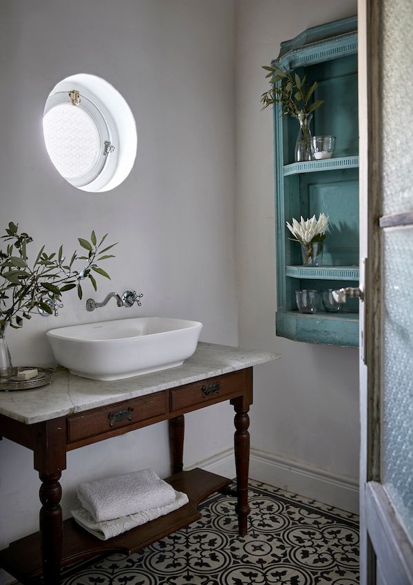 MIX MASTERED. The powder room is anchored by a patterned floor of encaustic tiles leftover from a project Charlotte undertook in her city home. A simple marble-topped vintage table got drilled in for the basin’s plumbing and upcycled into a charming vanity.