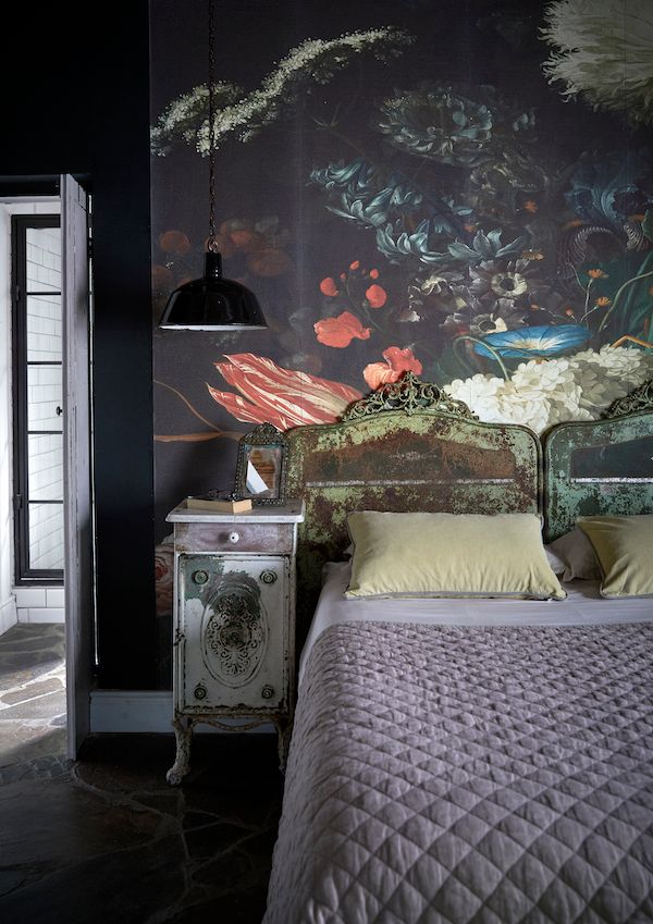 BEAUTIFUL DREAMER. The downstairs bedroom is an atmospheric, inviting space. The headboard consists of two pieces from single “peasant beds” from Poland that were welded together to form a queen headboard, says Charlotte. The gorgeous wallpaper—something she picked up in England before even buying the house—found its perfect spot and sets a dramatic tone.