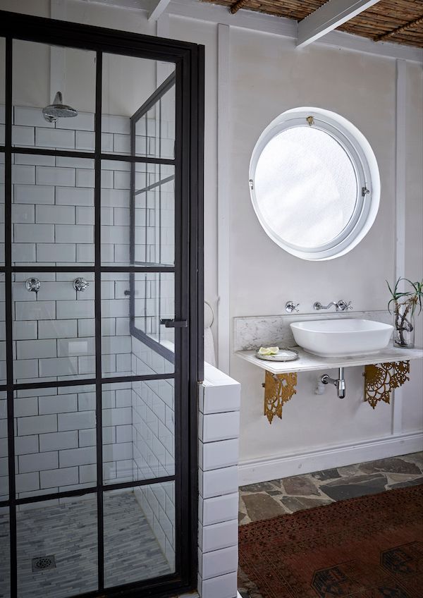 FRESH TAKES. Charlotte’s penchant for marrying old with new shines through in the ensuite bathroom, where vintage touches like the faded Persian rug, marble surfaces and intricate basin brackets—“its old ‘broekie lace’ which must have been salvaged from an old Victorian House,” says Charlotte. The black steel shower cubicle is a delightfully on-trend touch that brings the room into the 21st century.