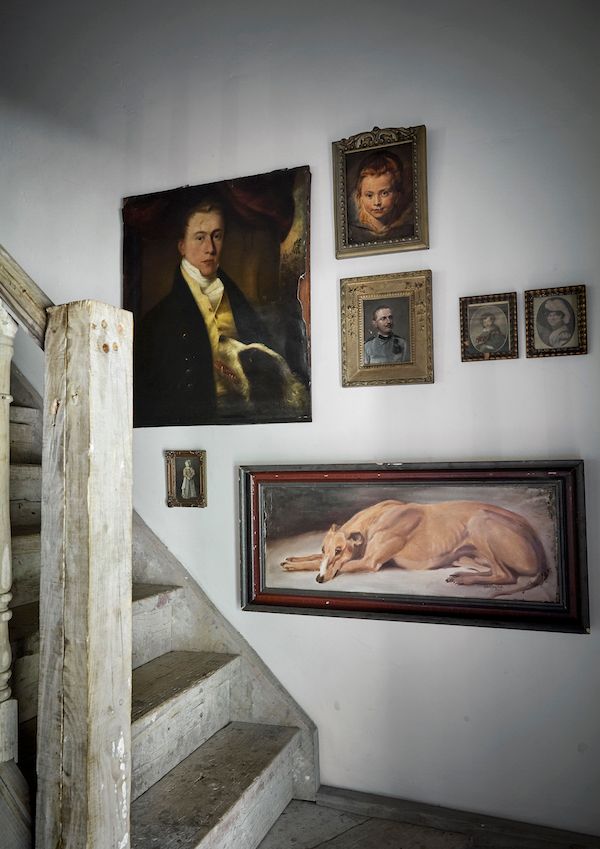 UP CYCLES. Charlotte is an avid collector of vintage portraits and the stairwell and staircase felt like the perfect place to create a gallery wall, she says. The stairs look like they have been around for years, and in a sense, they have, thanks to the old planks Charlotte gathered to form the stairway’s foundation.