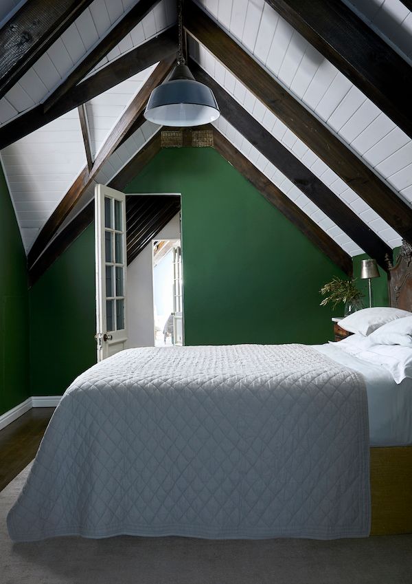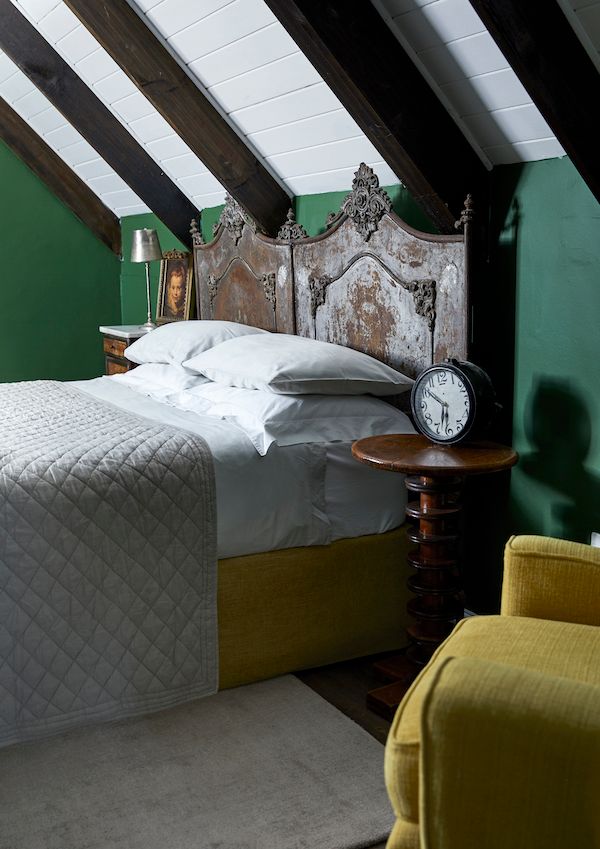 LOFTY AMBITIONS. An upstairs bedroom is tucked into the roof and is dressed in a mix of inviting textures. The contrasting monochromatic tones in the ceiling create a dramatic effect, toned down with salvaged and antique finds, like another headboard fashioned from two smaller ones.