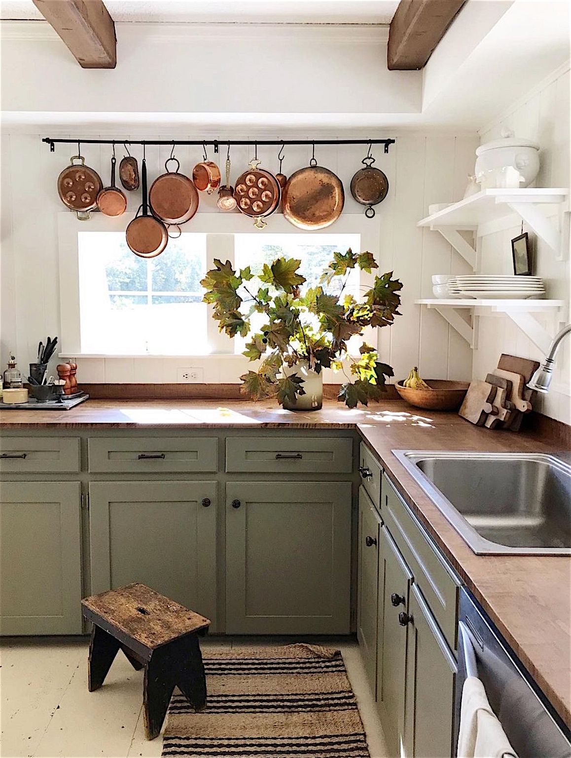 COLOR CONSIDERATIONS: I like to stick to a mostly neutral base with white walls and trim, and light painted floors, and then bring in warmth with wood tones and antique pieces. I think the trick to doing neutrals right is to add contrast, either with wood tones or painted black furniture. You can achieve a cohesive home by using the same materials, paint colors, or textiles in different rooms of your house. For example, my kitchen cabinet color (Benjamin Moore Hampshire Gray) is also used on the glass door cabinet in the living room. I used wood countertops in both the kitchen and the bathroom, and I use the same white paint throughout the entire house (Benjamin Moore White Dove).